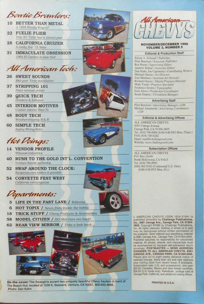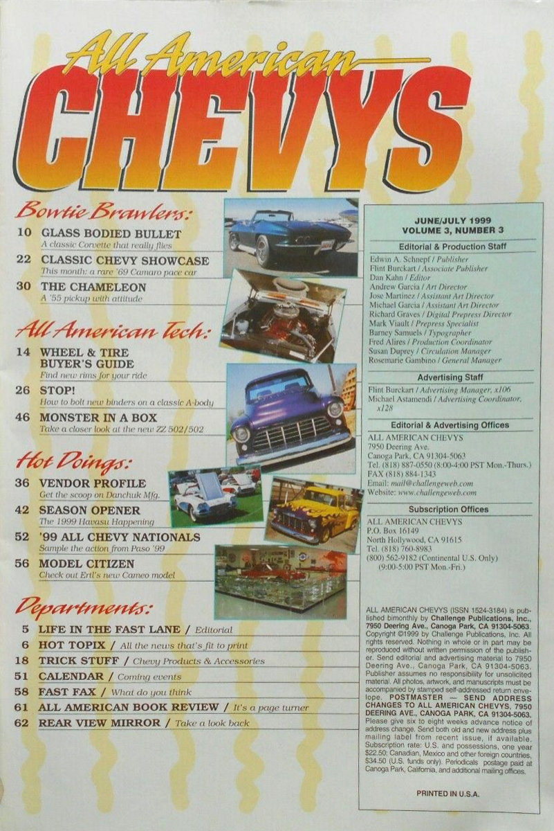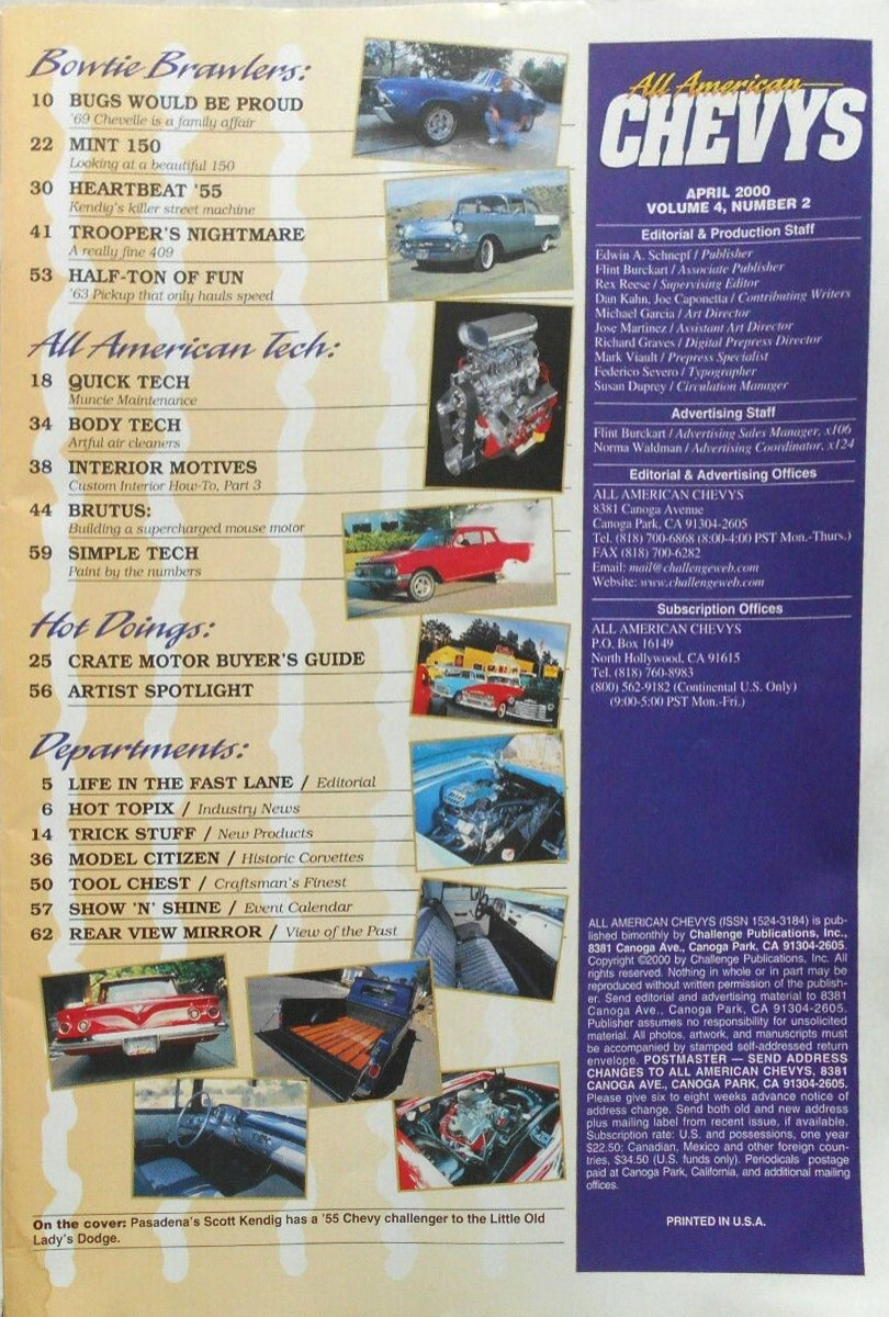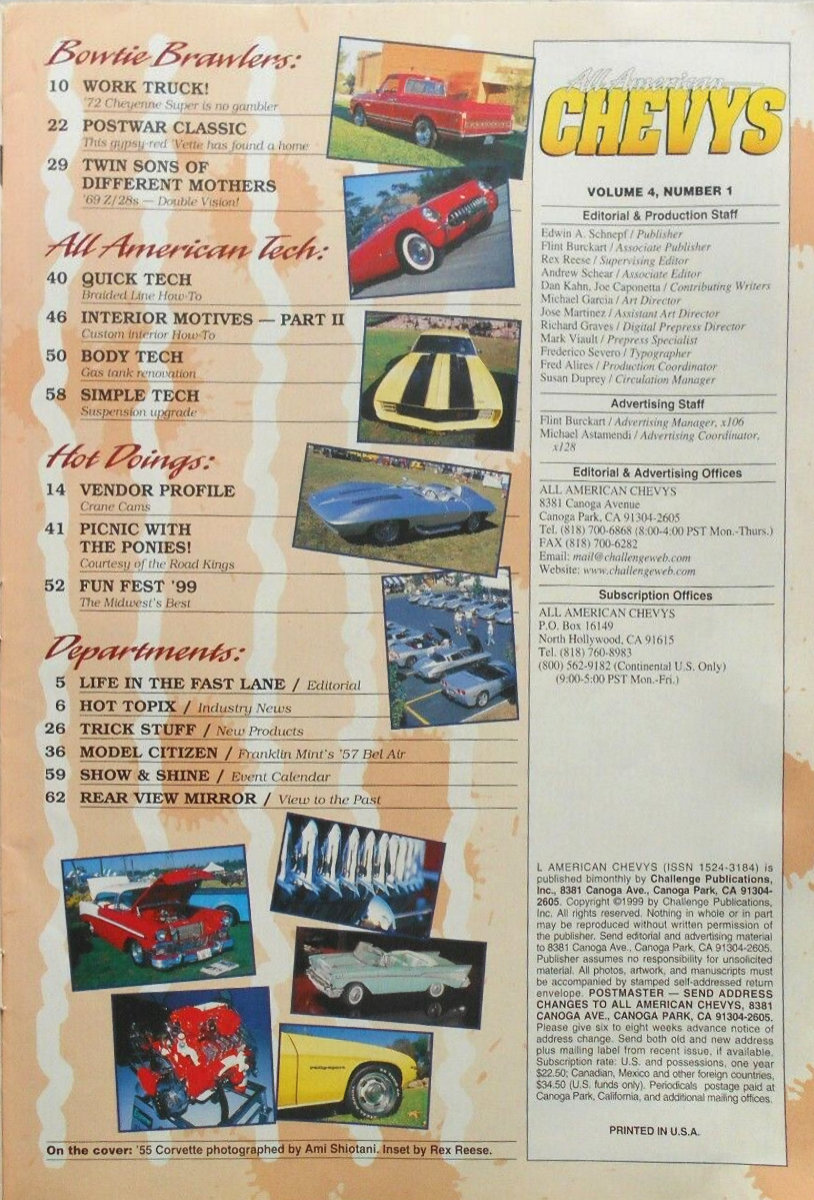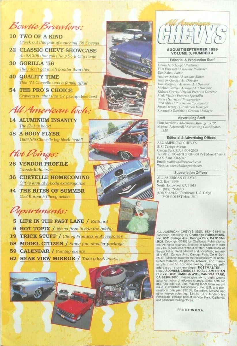 All American Chevys was published by Challenge Publications in Canoga Park, California. Content was focused on