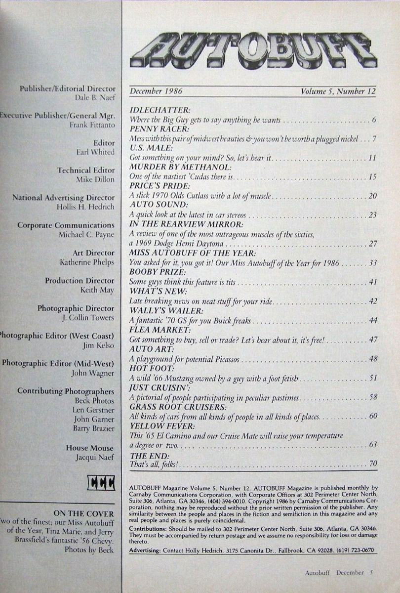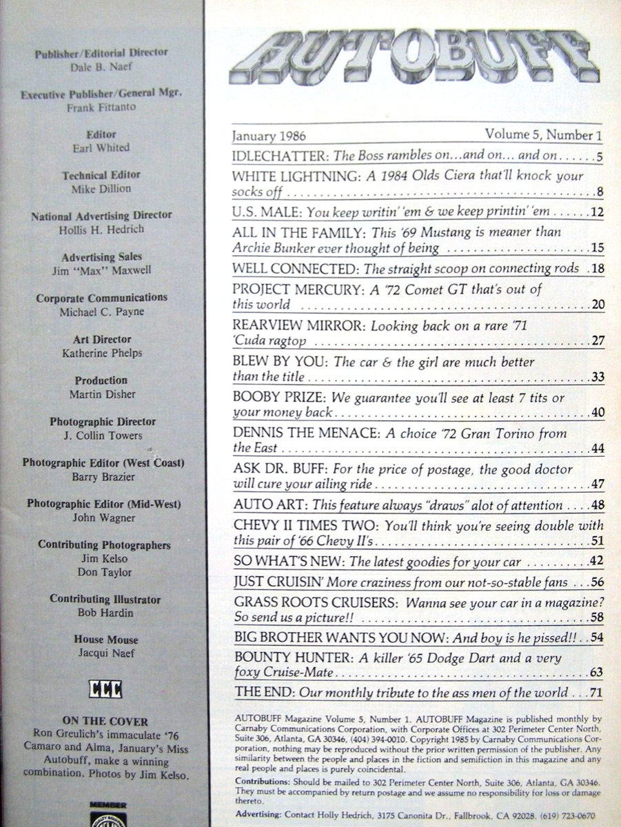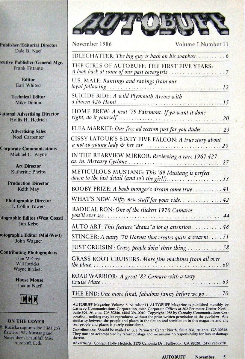 The title was a curious choice for a name. In modern times, "buff" has lost a meaning -- a devotee to a subject or activity. The phrase "auto buff" was a common but now is an old term describing the target market of the automobile publishing industry. But of several other current meanings, the term still means naked. So the authors chose a somewhat clever use of both meanings.