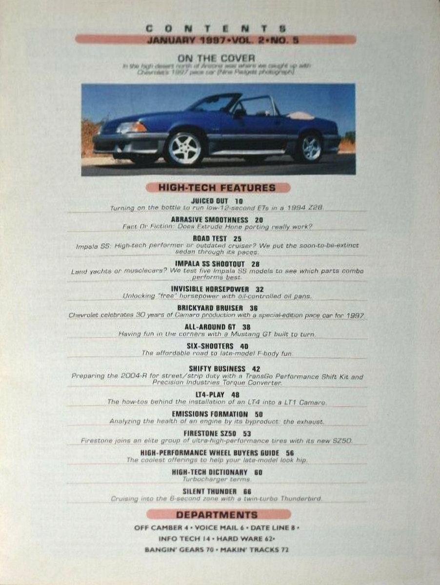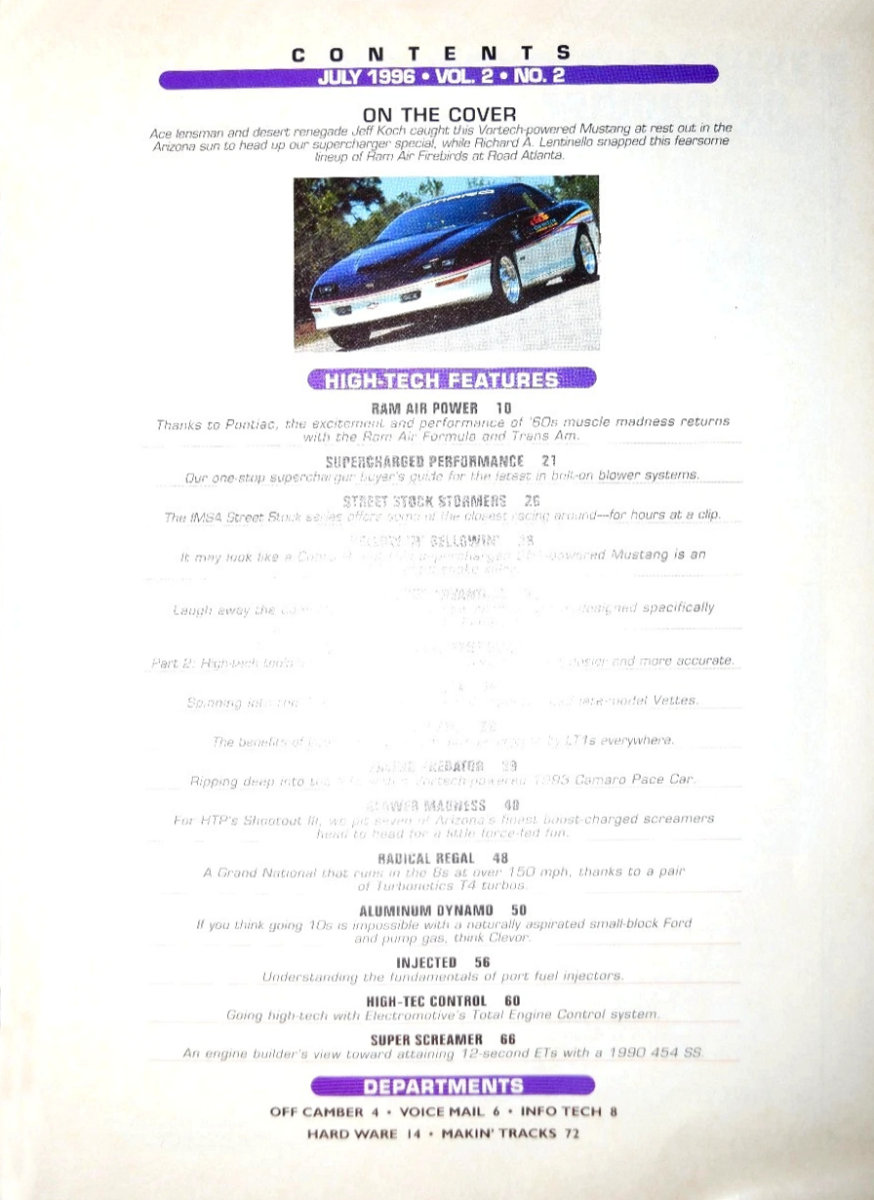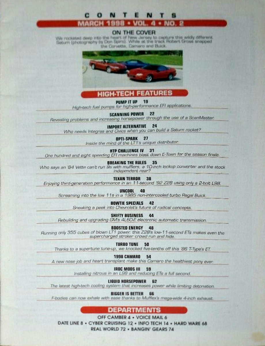 All the titles of CSK Publishing were sold to a division of Primedia, McMullen-Argus. Many magazines were being consolidated under two major players - Primedia and the former Petersen Publishing empire which had become EMAP-Petersen. With this consolidation came a situation where each publisher had multiple titles covering the same general content and target readership. Some magazines disappeared, but other publishers chose to focus more carefully. So in September, 1998, HTP was re-titled to GM High Tech Performance (GMHTP) and shifted content to cars from General Motors.