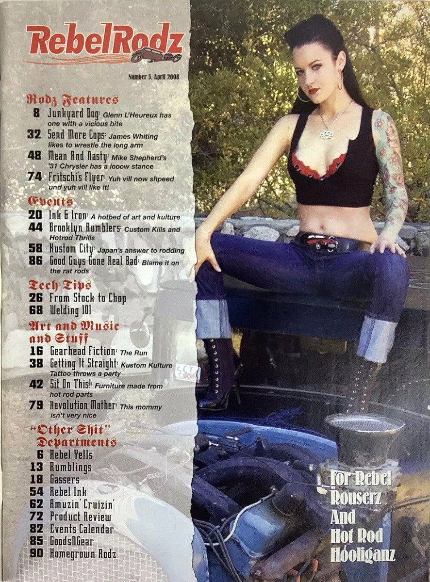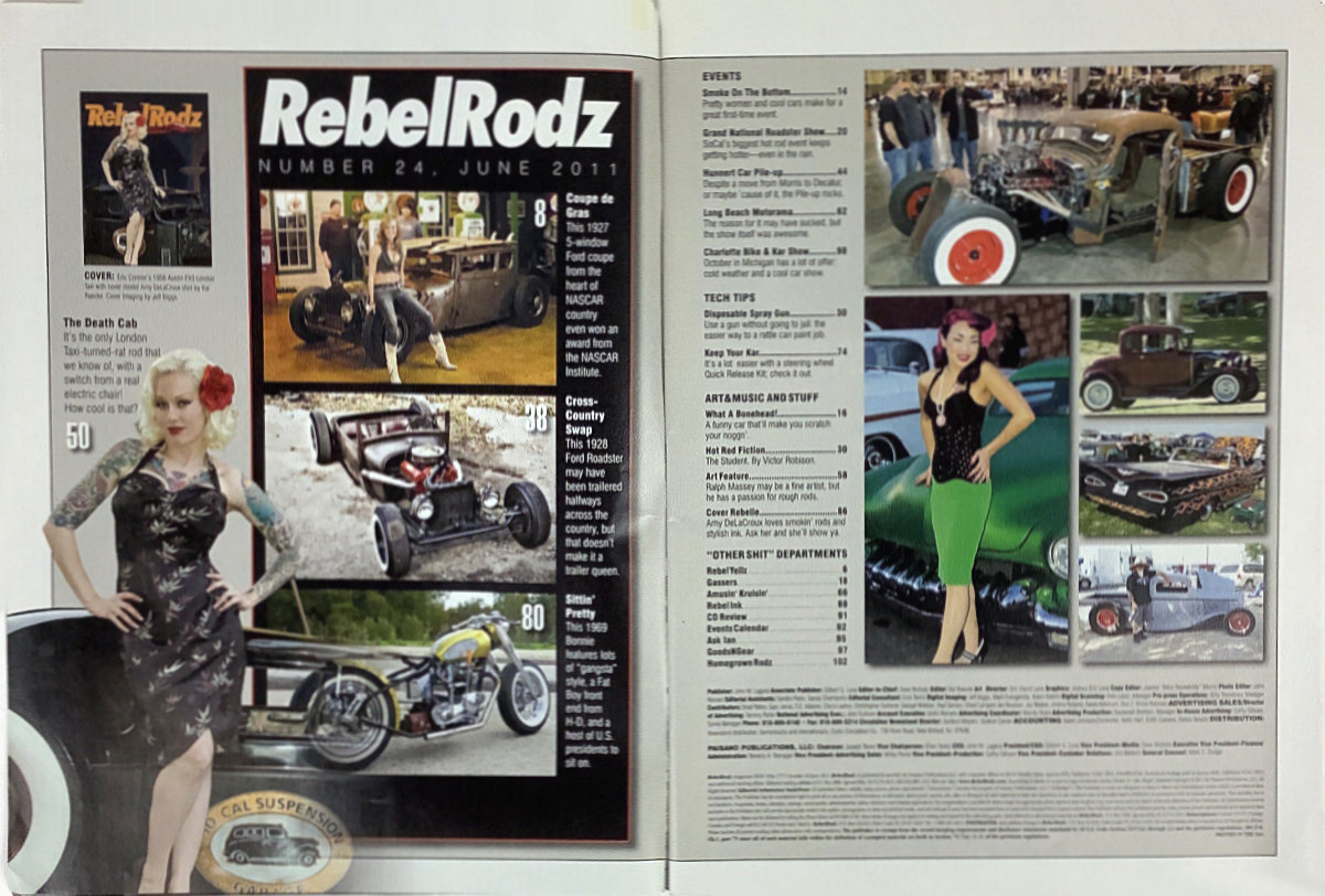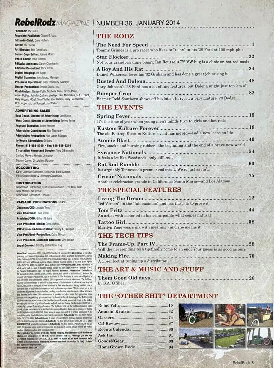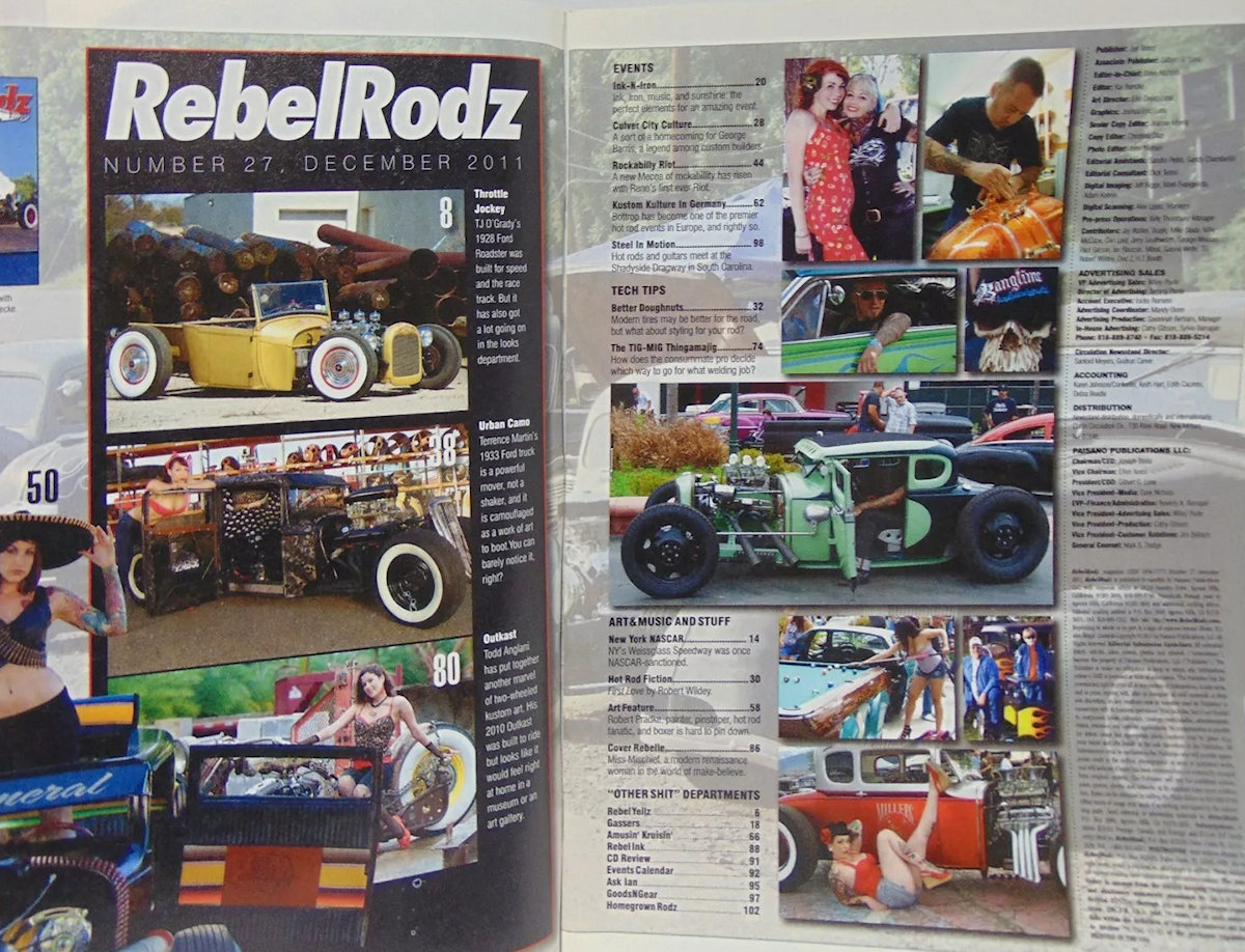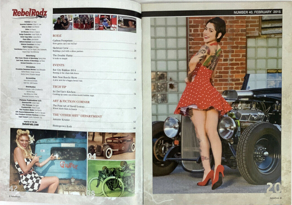 Rebel Rodz had a regular print cadence through 2012 as a bi-monthly title, then became more of a quarterly magazine in 2013 and 2014. The last year appears to have been 2015 when the print cadence slowed, the publisher issued two "book-a-zines" with 100 plus pages of rods and "betties", and the publisher offered a "double-pack" where Rebel Rodz was provided with a subscription of Tattoo magazine. Clearly the end of print publication was near.