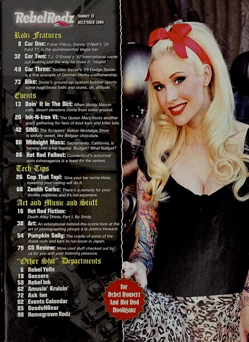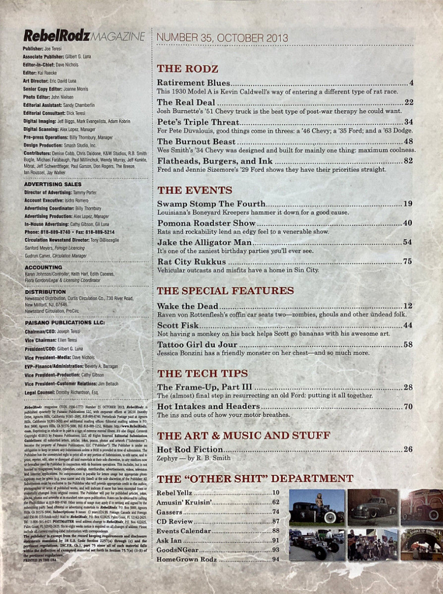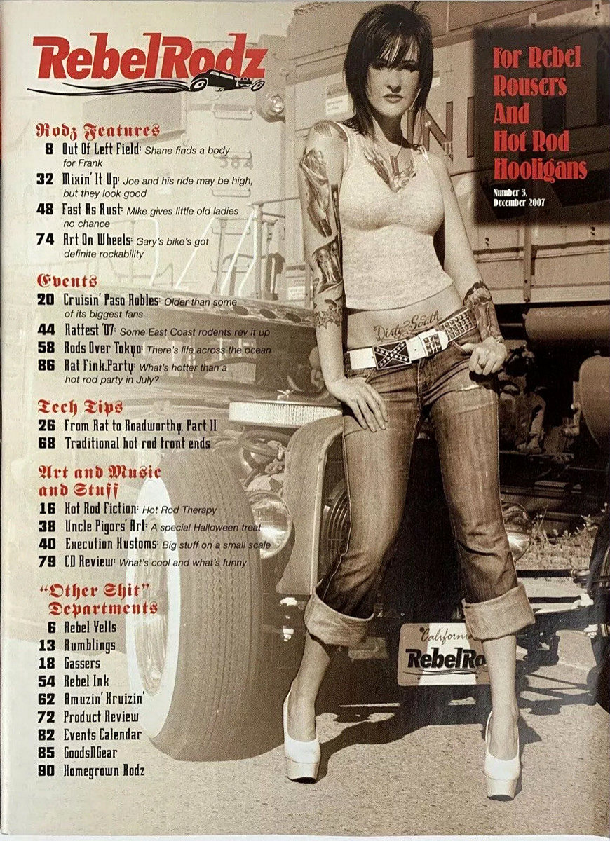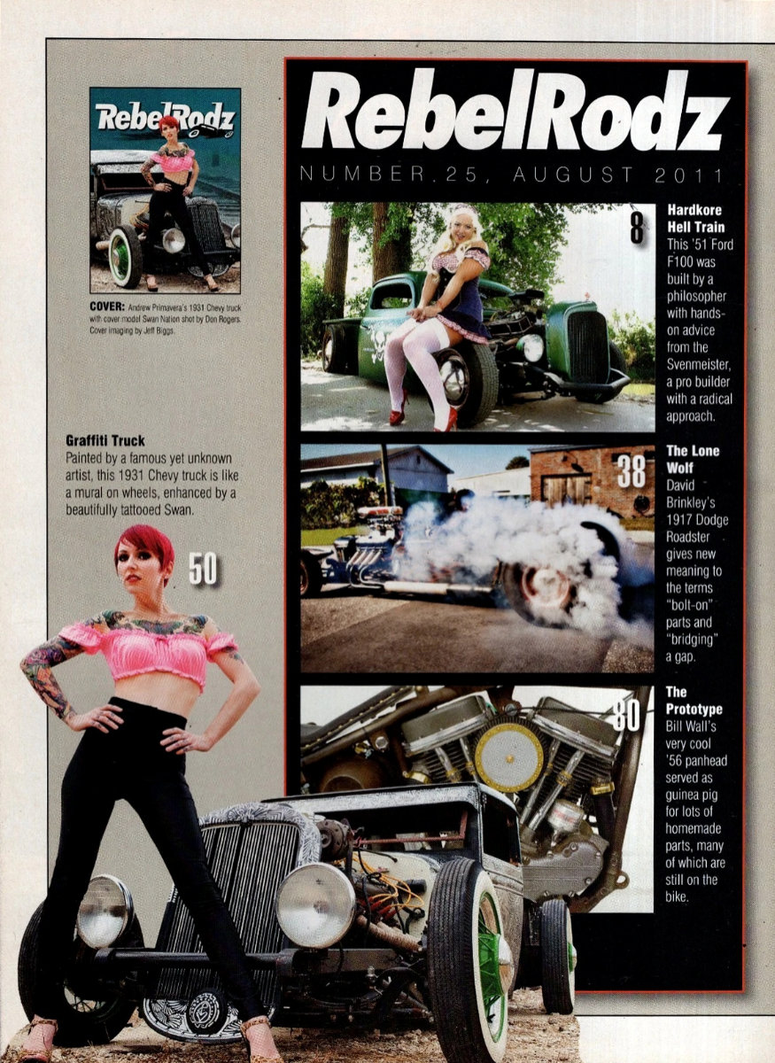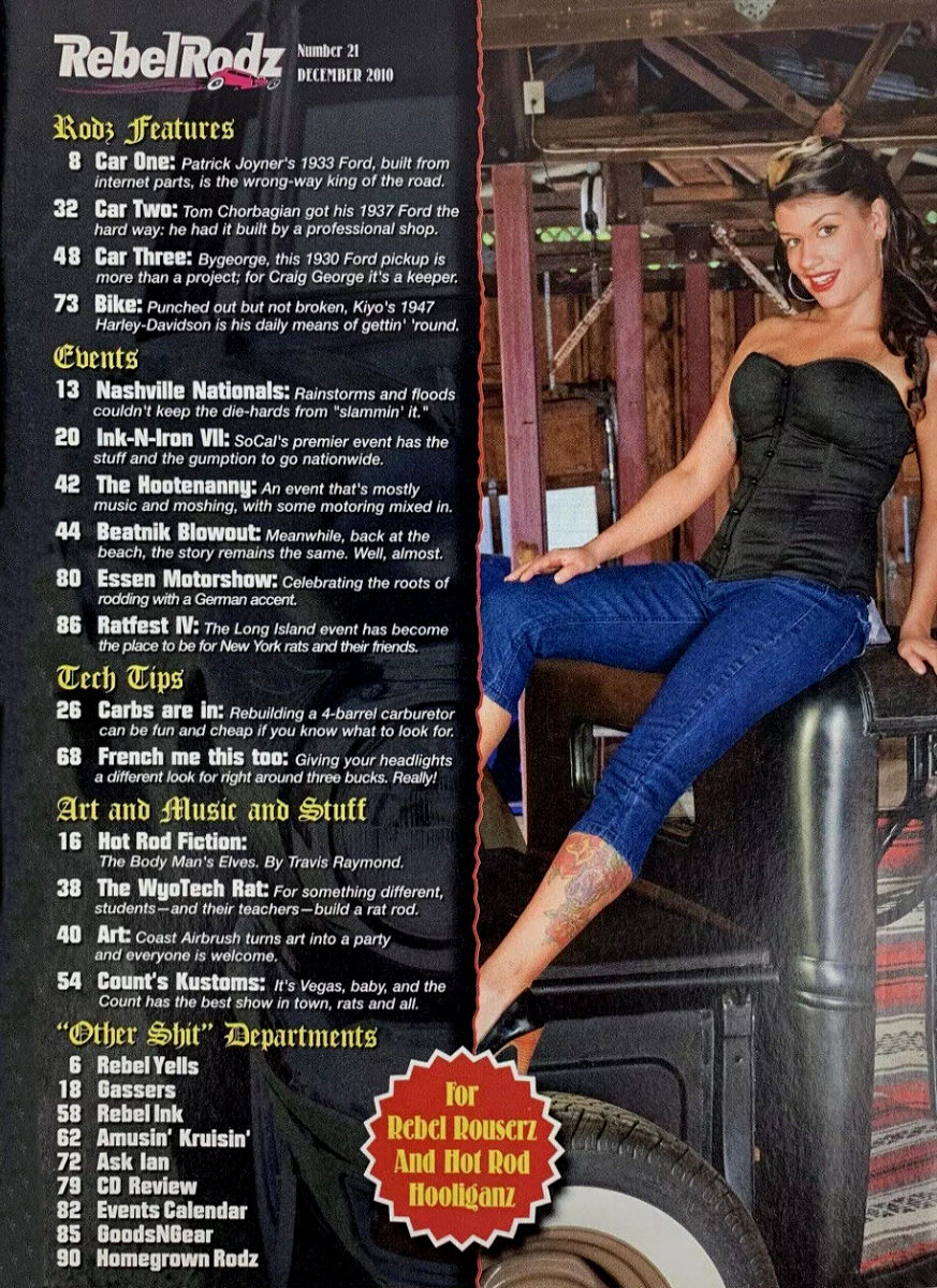 Rebel Rodz had a regular print cadence through 2012 as a bi-monthly title, then became more of a quarterly magazine in 2013 and 2014. The last year appears to have been 2015 when the print cadence slowed, the publisher issued two "book-a-zines" with 100 plus pages of rods and "betties", and the publisher offered a "double-pack" where Rebel Rodz was provided with a subscription of Tattoo magazine. Clearly the end of print publication was near.