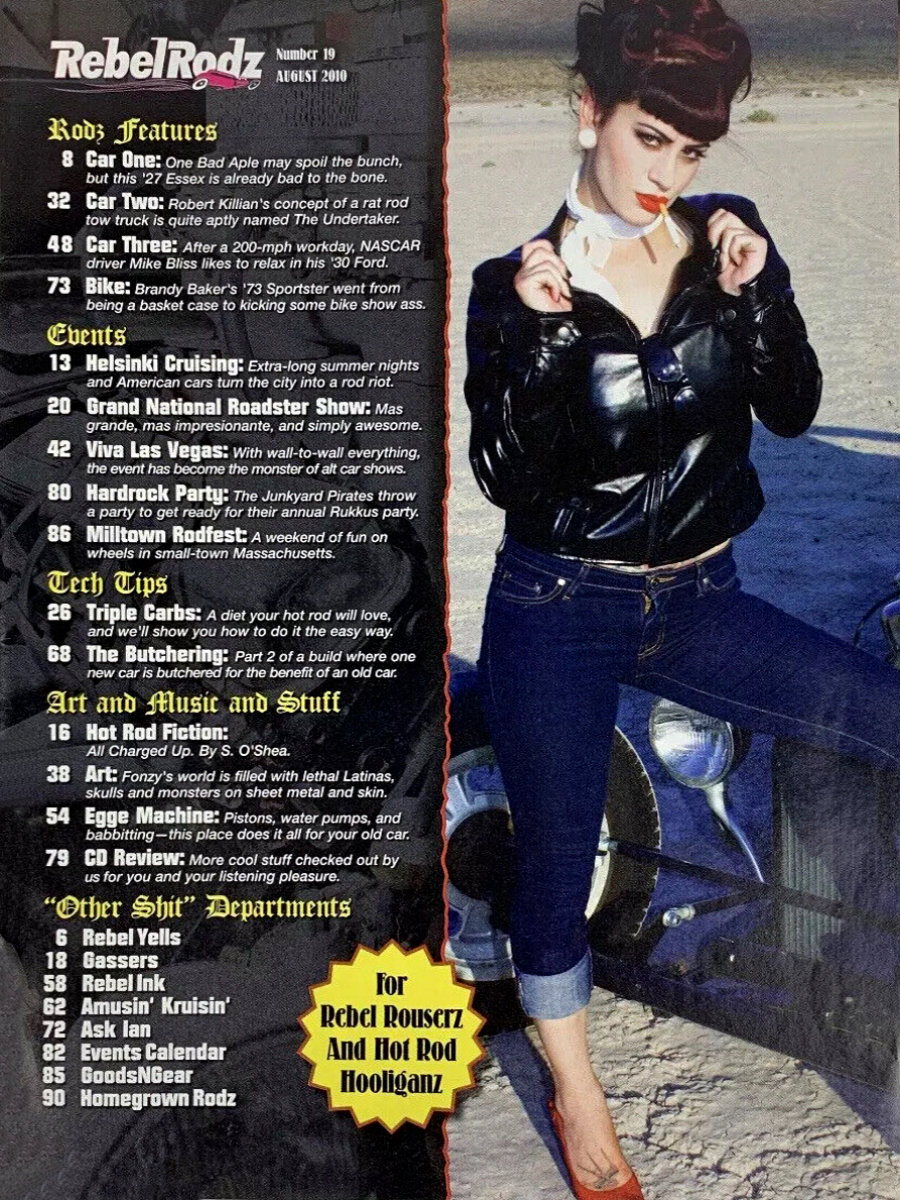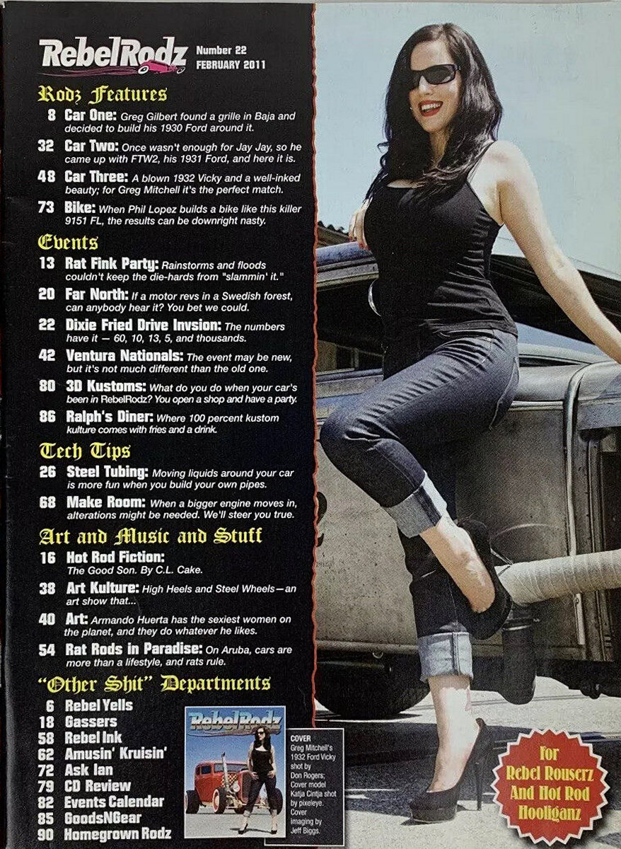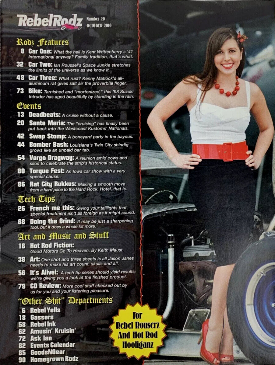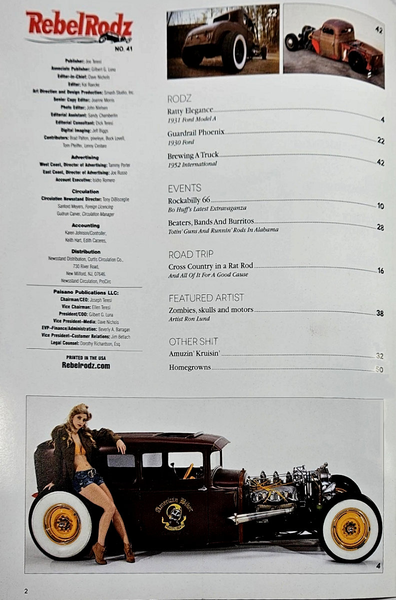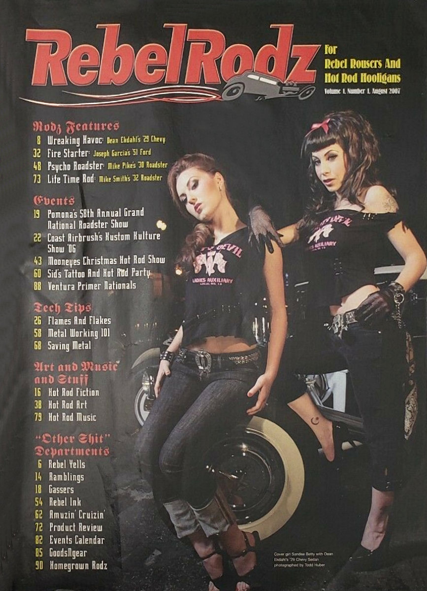 Rebel Rodz had a regular print cadence through 2012 as a bi-monthly title, then became more of a quarterly magazine in 2013 and 2014. The last year appears to have been 2015 when the print cadence slowed, the publisher issued two "book-a-zines" with 100 plus pages of rods and "betties", and the publisher offered a "double-pack" where Rebel Rodz was provided with a subscription of Tattoo magazine. Clearly the end of print publication was near.