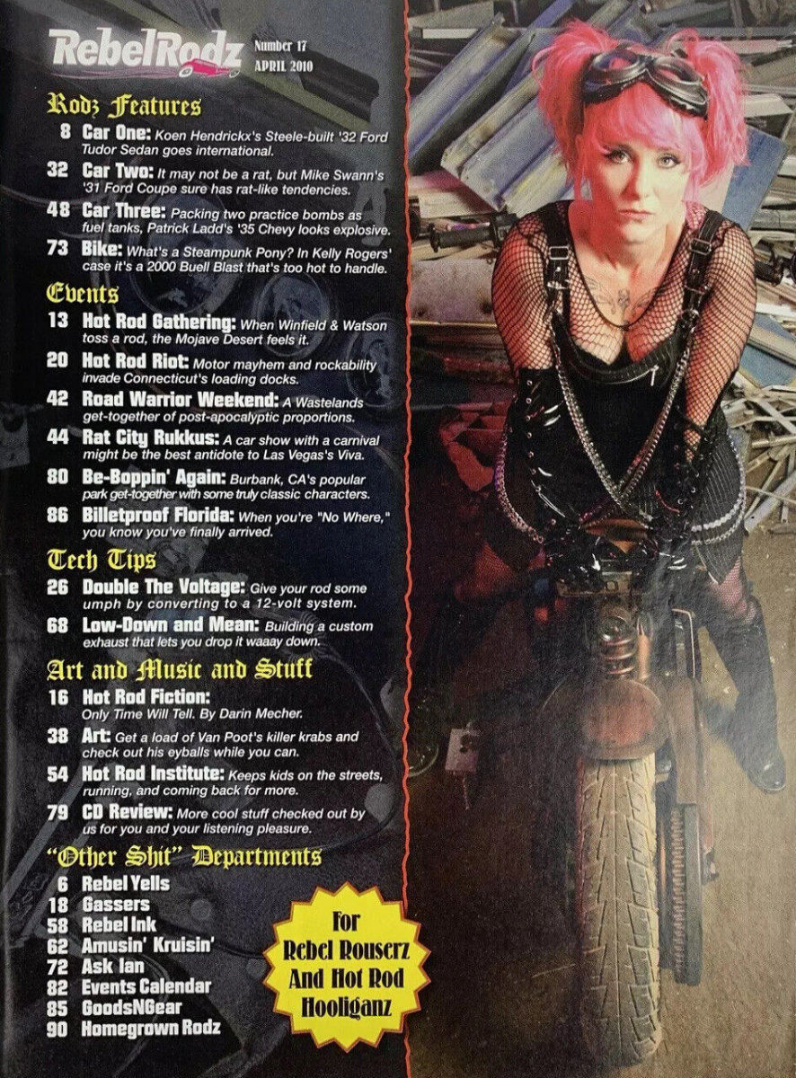 of "kustom kulture" lifestyle car magazines featuring kool and nasty rat rods and custom bikes, hot babes, and lifestyle oriented events.