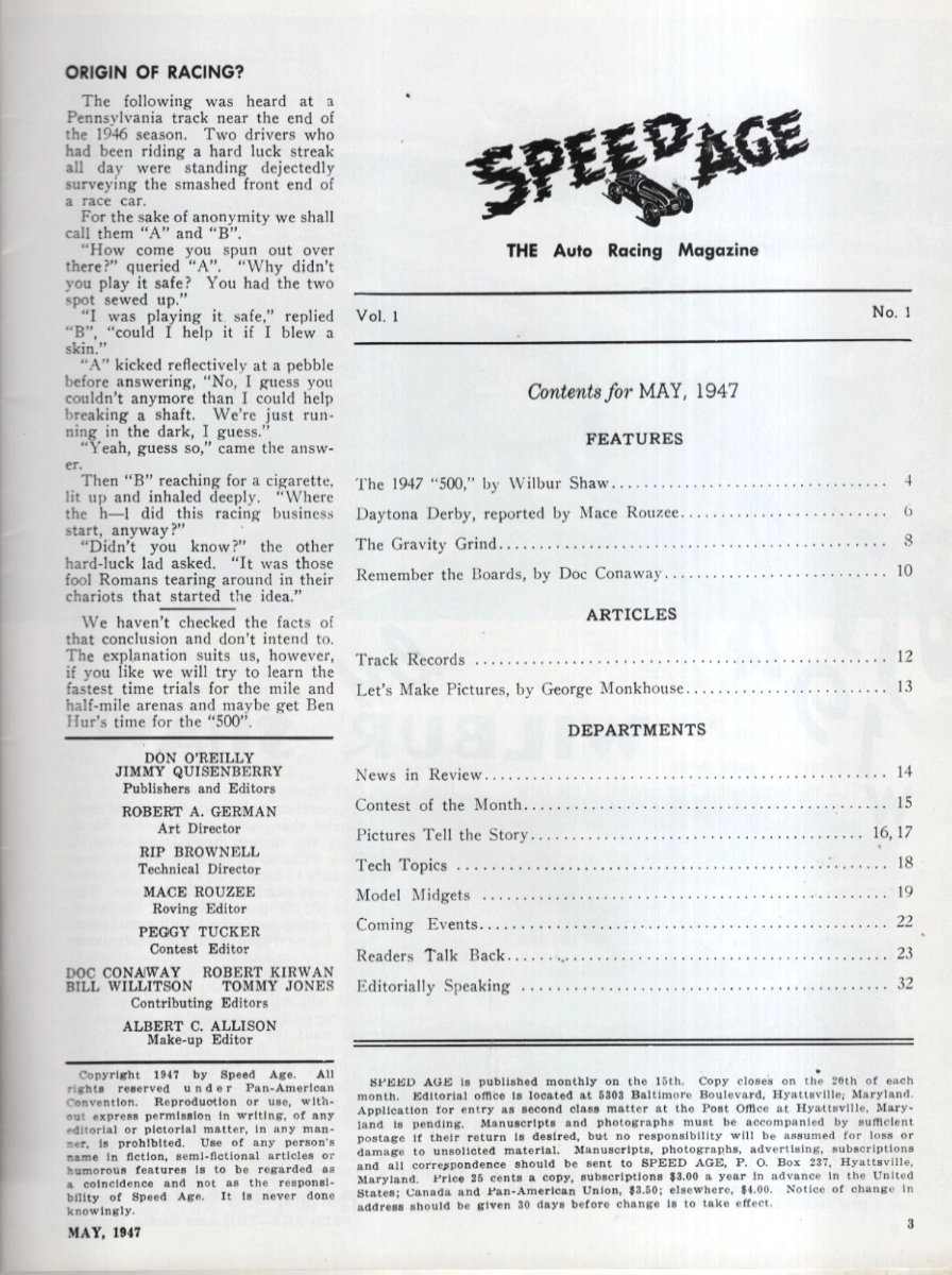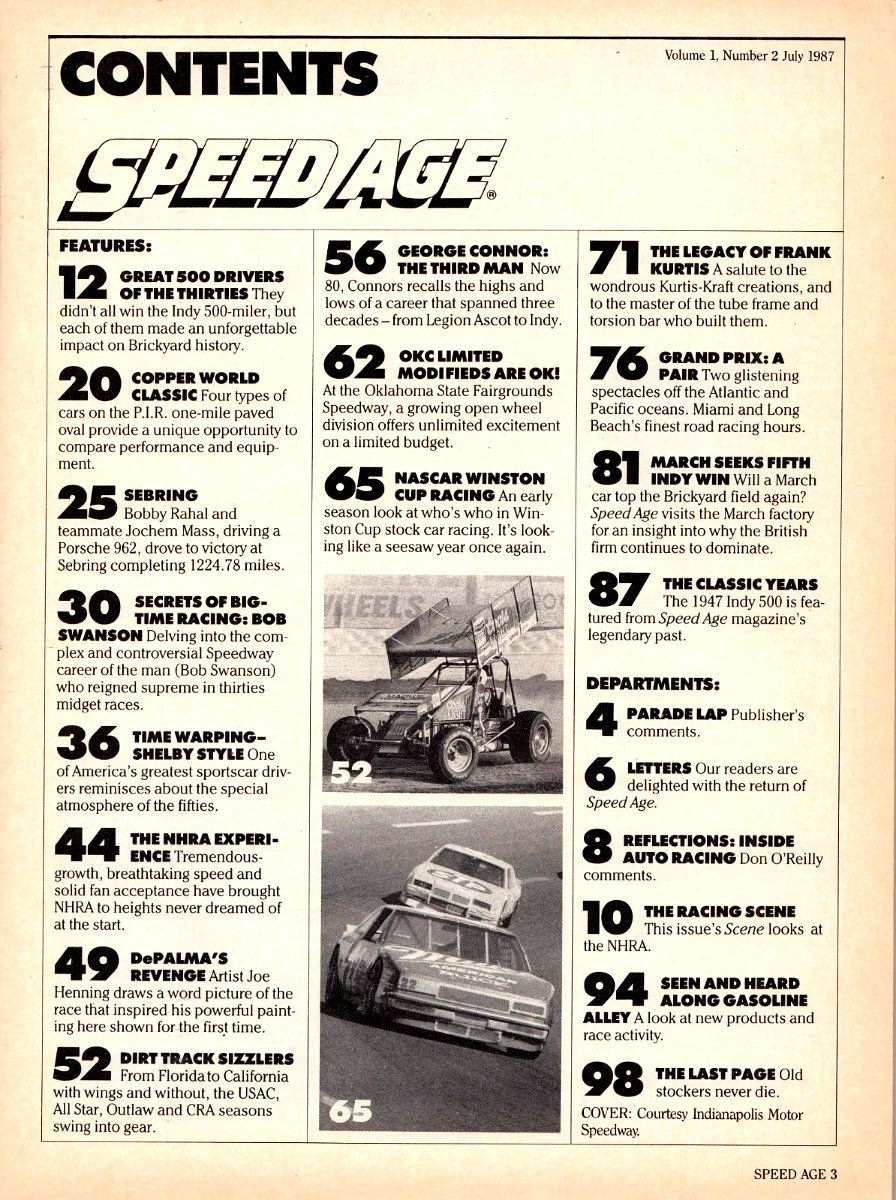 Jack Pelzer was the publisher of the resurrected title after a 35 year hiatus. He grew up in Los Angeles and loved motor racing and midget racing from the 1940s and 1950s. With editorial offices in Oxnard, California, he took a unique approach to content. He had current features on NASCAR, Indy, land speed racing and USAC sprint cars. But it also included re-published classic stories from the original Speed Age magazine. For example, the premier issue had articles on Johnnie Parson's Indy win in 1950 and coverage of the 1952 Pike's Peak race. The first issue even brought back the veteran Don O'Reilly for a feature article.