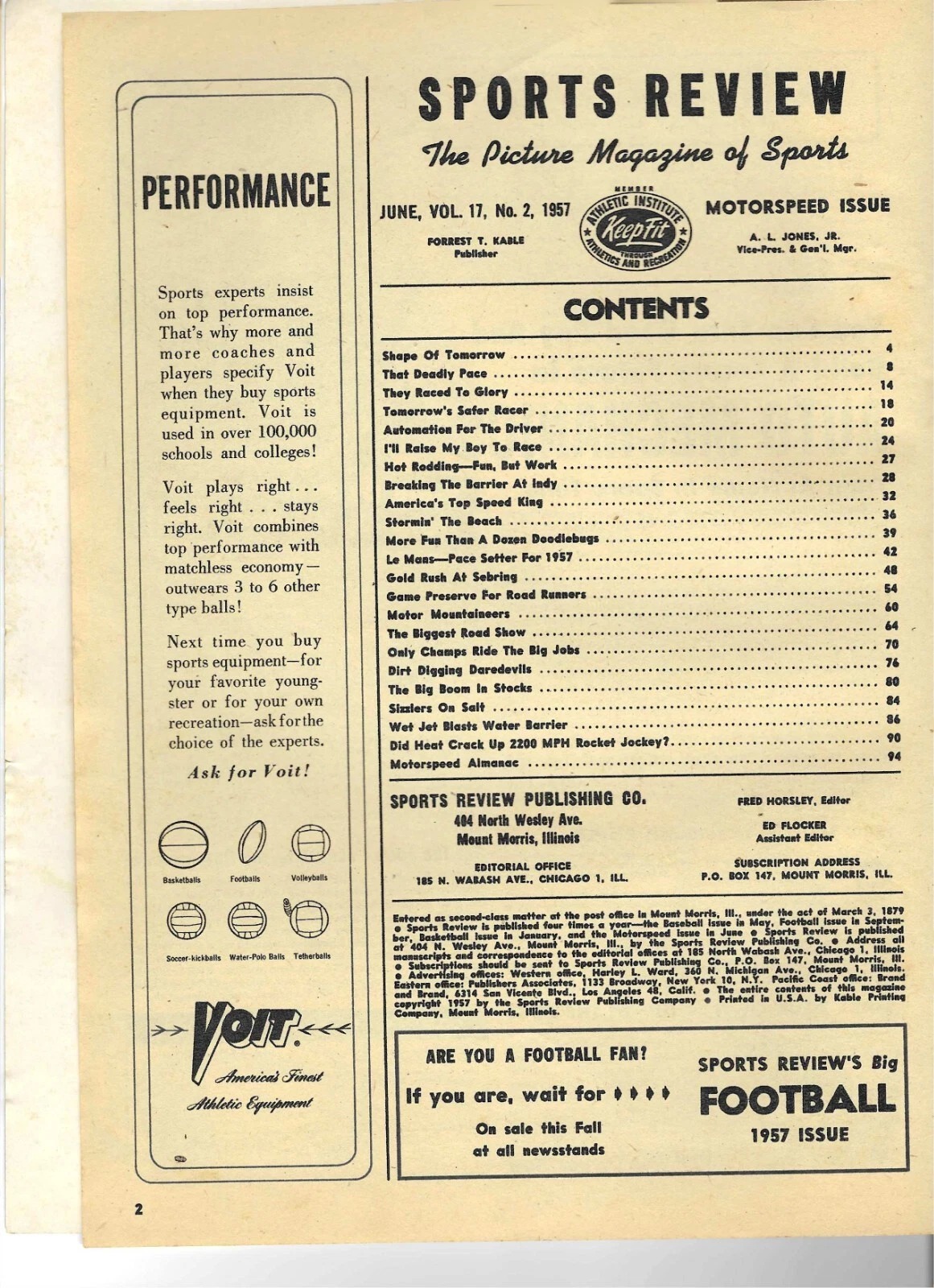 Sports Review's Motorspeed magazine was published annually by Sports Review Publishing Company, 185 North Wabash Avenue (and later at 404 North Wesley Avenue), Chicago, Illinois. The publisher was Forrest Kable who also owned Kable Printing Company in Mount Morris, Illinois, one of the largest magazine printer and distributor houses in the United States.